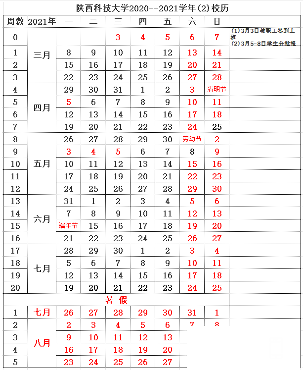 陕西科技大学暑假7月26日-8月27日